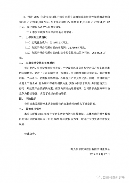 2023年1月16日,海光信息发布《2022 年度业绩预告》的公告。