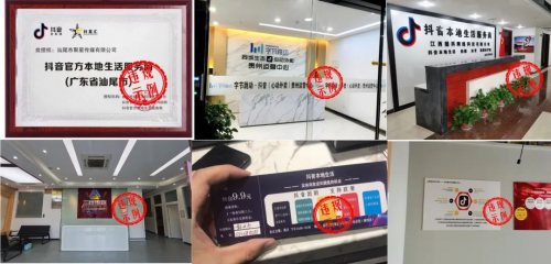 违规行为:两公司在经营场所、网络平台及招商会、特训营等线下招商活动中未经许可使用我司注册商标,并在上述线上、线下场景大量使用“抖音团购官方发布”“抖音团购贵州实体帮扶服务中心”“抖音实体孵化中心”“抖音巨量引擎一级服务商”等话术宣传冒充抖音官方或签约服务商。