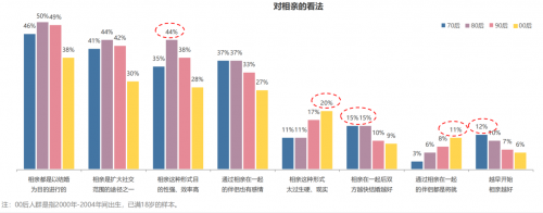 无论哪个代际的被访者,认为“相亲都是以结婚为目的进行的”占比均为最高。“70后”认为相亲要趁早、相亲成功也要尽快结婚;“80后”则是对相亲的目的性并不反感,而对其高效率表示赞同;“90后”相较而言对相亲更加抗拒,但同时也较为认可相亲的社交作用和目的性;而“00后”普遍认为相亲的形式太过生硬,从而对相亲表现出较大的抗拒。
