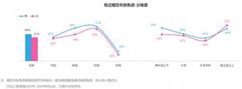 超四成被访者有过“婚恋年龄焦虑”,其中男性略高于女性。《报告》显示:从“70后”到“90后”,婚恋年龄焦虑不断加重;“90后”有过婚恋焦虑的占比最高,为50%;硕士及以上学历的被访者在适婚年龄都更为焦虑。