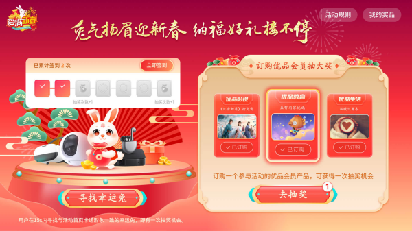 春节期间,百视通还将联合四大运营商举行线上活动,为春节的新春纳福准备了一系列礼品。1月底至2月初,上海电信用户参加“兔气扬眉迎新春,纳福好礼接不停”活动、上海移动用户参加“新春订购抽盲盒赢好礼”“ 体育包新年特惠”活动、上海联通用户参加“新春超值钜惠”活动,均有重要折扣优惠,满足条件还可以抽取各类月包、年包福利。上海东方有线用户参加“福兔相伴新年好礼送不停”活动,收看节目助力狂欢,扫描二维码参与抽奖,即有机会获得新春惊喜好礼。
