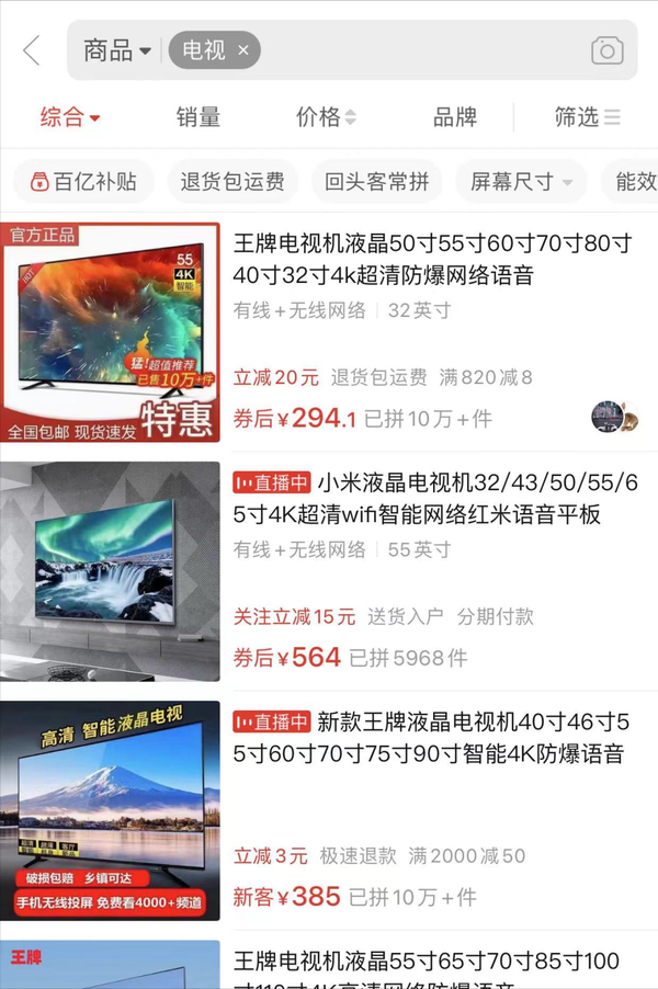 如今电视行业的低价竞争已经把价格下限打到了200元~300元区间。从拼多多搜索“电视”关键词,可以发现200~600元的电视已经随处可见。32寸液晶电视的价格已经低到了294元。而尺寸稍大一些的32寸液晶电视也不过338元。但电视还是卖不动,这意味着行业已经到了非常危险的境地。