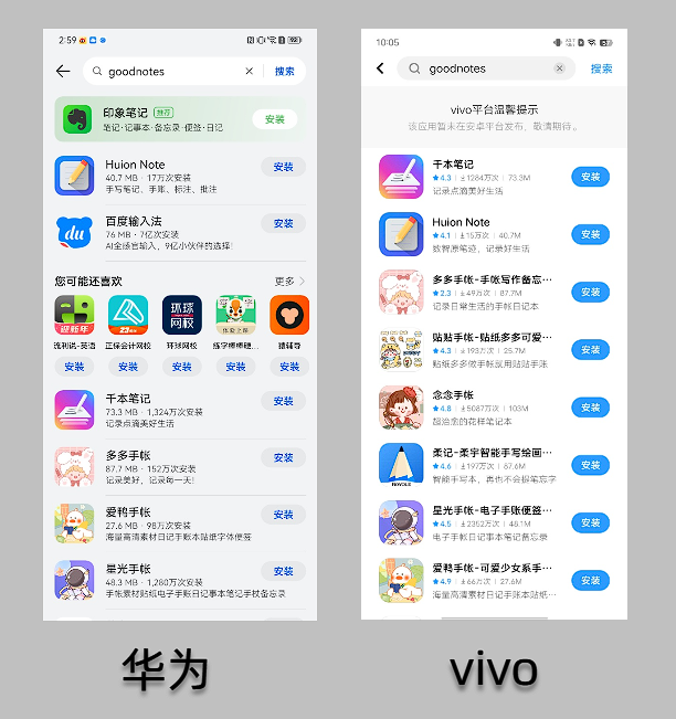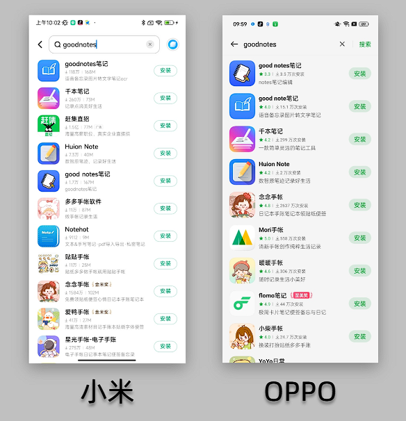 搜索关键词GoodNotes,OPPO、小米应用商店有名字只差一个字的疑似山寨App,图标也十分相似。