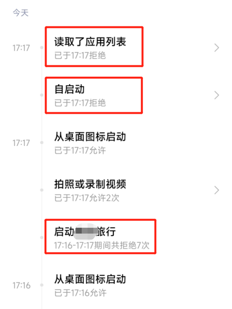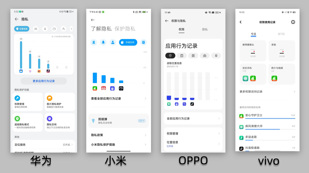随着大众对隐私安全关注度的提升,各品牌手机都加入了应用行为记录功能。我们可以清晰地看到App在什么时候使用了哪些权限。