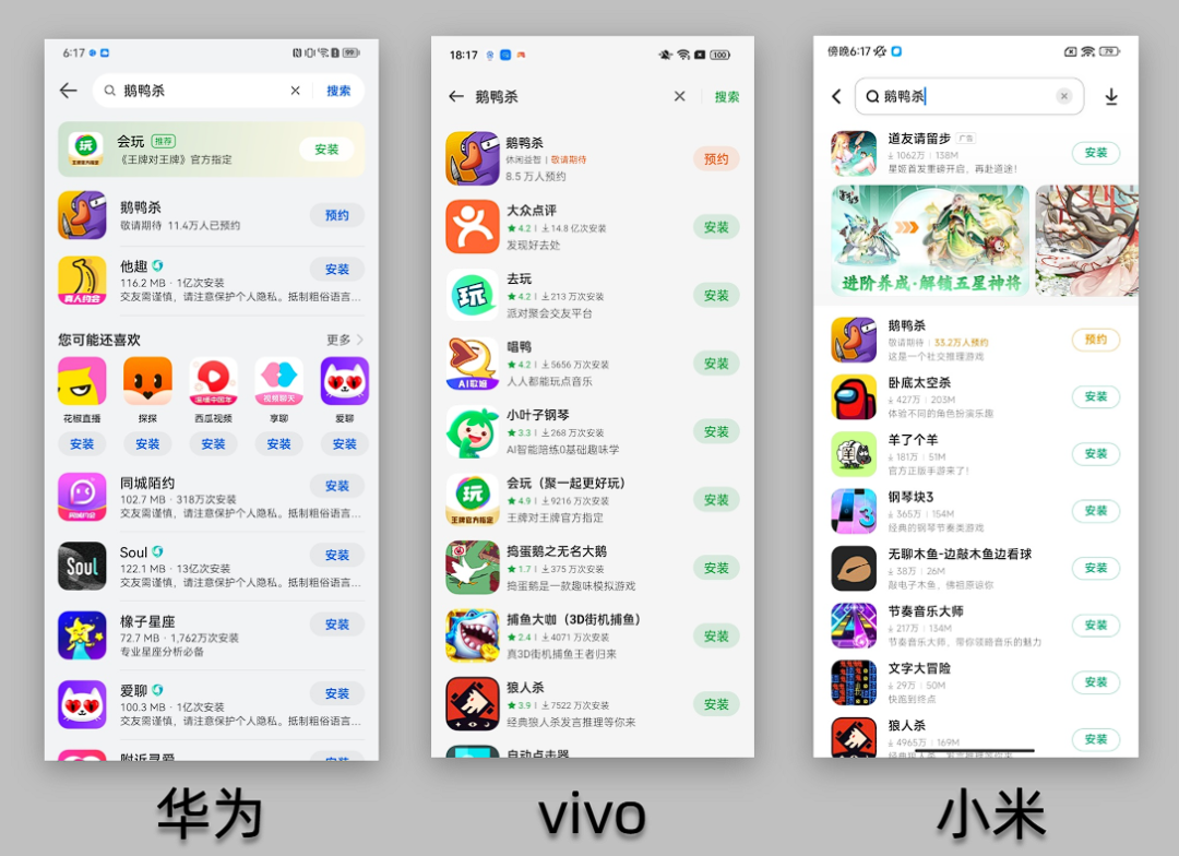 至于最近很火的游戏鹅鸭杀,华为、OPPO、小米无疑似山寨App,只有登陆应用商店的预告。