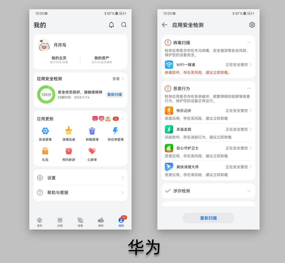 此外,华为应用市场还自带应用安全检测,可全天监控设备上已安装应用的安全情况,及时保障用户应用隐私安全。