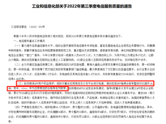 根据工信部《2022年第三季度电信服务质量的通告》显示,在对重点应用商店及分发平台的检查中,vivo、华为应用市场的合格率名列前茅。