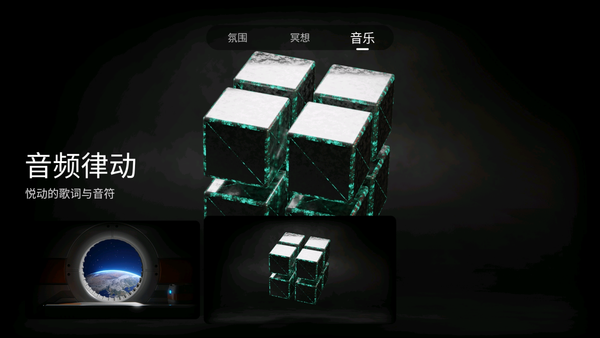 还有另一大特色就是当贝OS系统拥有全新的氛围,不仅可以选择自己喜欢的主题背景,还支持“音乐律动、冥想”模式,音乐律动会随着音乐的节奏不断的律动画面,在冥想模式中还可以营造一个宁静想和的环境,在晚上睡上一个舒服的好觉。