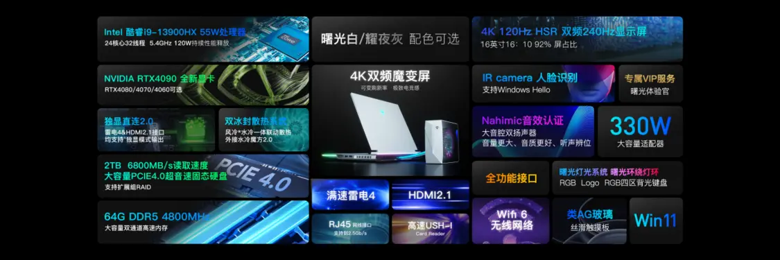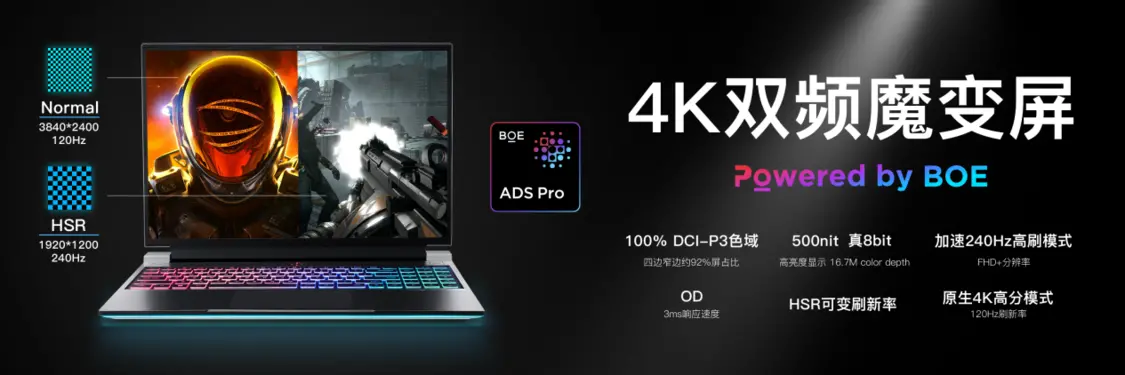 曙光16Pro的配置也非常硬核,感官体验全面升级。屏幕方面采用了16英寸16:10显示比例的4K双频魔变屏,四边窄边框设计,屏占比高达约92%。支持100% DCI-P3色域,500nit亮度。而且,搭载HSR像素变化的行业顶级双频显示屏,可以实现原生4K 120Hz高分辨率模式与FHD 240Hz高刷模式的切换。一台曙光16 Pro,屏幕双频切换,满足你的不同需求。并且,与RTX4090与4080显卡强大的性能完美结合,可以说4K游戏时代正式来临。