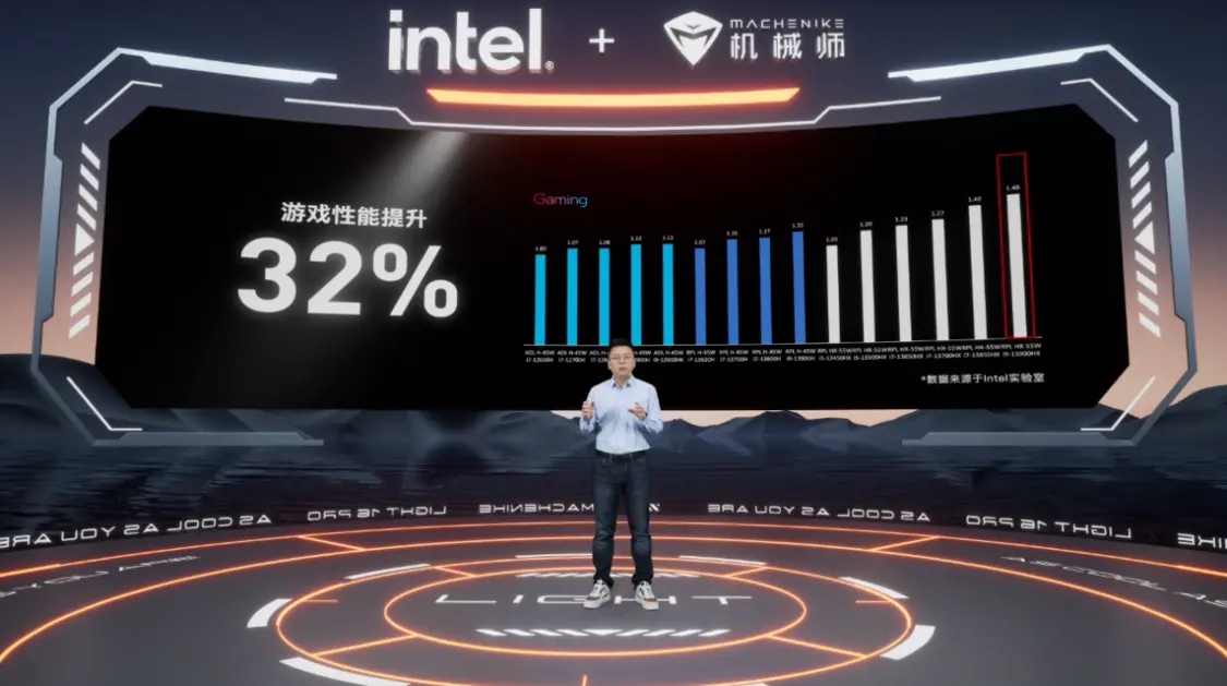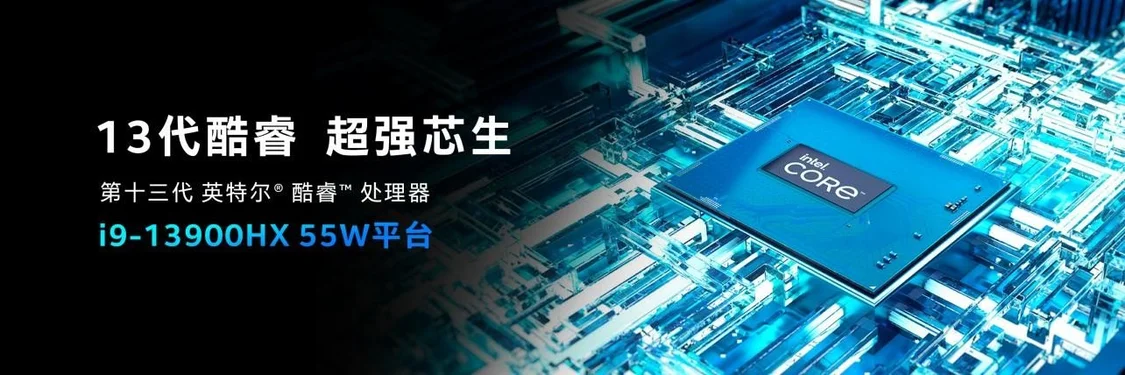 英特尔全新的RPL 13代HX处理器55W平台,双芯片设计,媲美台式机级别的性能表现,不锁频并且支持超频,以及内存XMP超频。相较于12代i9-12900H处理器游戏性能提升32%,多核性能提升达到了约40%。