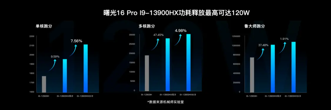 曙光16 Pro 水冷模式下CPU功耗最高释放并维持在120W。R23跑分来看,水冷模式进一步提升CPU性能释放,提升幅度高达7.56%,多核性能提升幅度可达4.98%,鲁大师的CPU跑分同样水冷情况下相比12900H提升超过40%。
