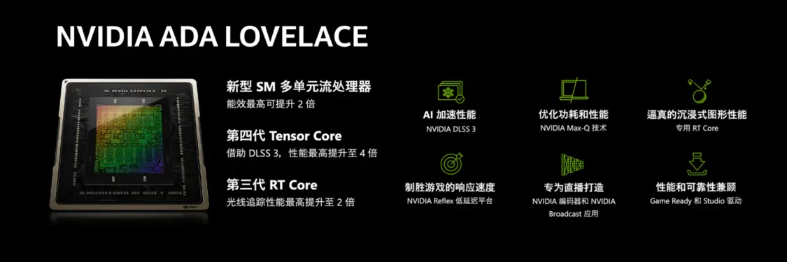 显卡方面,搭载全新的NVIDIA RTX40系显卡,最高配置为RTX4090显卡。支持DLSS3,第四代的人工智能技术,在游戏中可以带来突破性的提升。在不影响画质和响应速度的前提下,利用AI加速,可以带来更高的帧数表现,更流畅的体验。