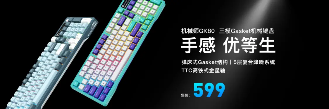 极致的电竞体验除了核心的电竞本之外,更少不了潮酷的外设搭配。2022年机械师KT68智慧屏机械键盘首发即售罄,随后推出的GK80机械键盘同样也能为各位玩家带来惊喜。创新的采用了弹床式GASKET结构,通过拥有11个支点的弹床式夹心硅胶,搭配具备形变记忆的弹性PC定位板,与轴下消音硅胶、FR4玻纤电路板、底层硅胶共同构成5层复合降噪系统,打造出声音纯净手感逆天的GASKET机械键盘。在轴体上,机械师GK80首发搭配TTC高铁式结构金星轴,独特的贯穿式长轨道,保证触发更稳、更顺、更丝滑。