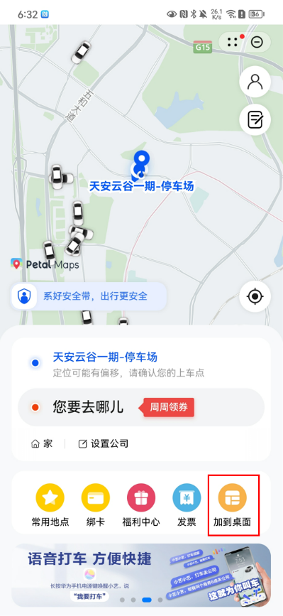 4.点击右下方【加到桌面】按钮,添加服务卡片到桌面。(首次激活该功能,需同时在手机桌面添加Petal 出行服务卡片)