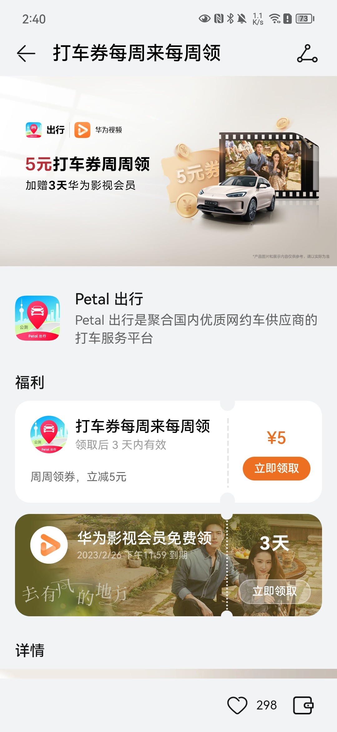 现在用Petal 出行还有多重优惠等你来领:每周可领取一张立减5元打车券,此外还可0元领取1次“3天华为影视会员”权益,畅看华为影视+芒果TV海量内容;每周打车满3单,可立即领取8元打车券。使用Huawei Pay支付或华为支付首次绑定银行卡、开通免密支付的用户,还有更多惊喜优惠。