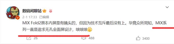 数码闲聊站还指出,小米MIX Fold 2原计划在内屏上配备前摄,但是因为技术互斥最后没上。看来,小米MIX Fold 3会在内屏上配备屏下前摄。