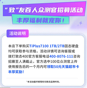 另外,购买TiPlus7100 1TB、 2 TB固态硬盘的用户还可以参加“致”友百人众测活动,领取额外福利!赶快前往致态官方微信,即刻报名参加吧!