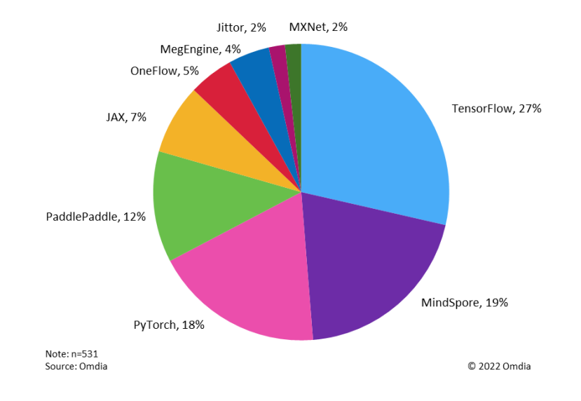 2023年2月6日,行业研究机构Omdia(Informa tech集团旗下)发布了《中国人工智能框架市场调研报告》,深入分析了中国人工智能框架市场的竞争格局,产业现状与创新趋势。Omdia通过调研发现,PyTorch、TensorFlow、MindSpore等人工智能框架在知名度与市场份额上处于第一梯队。
