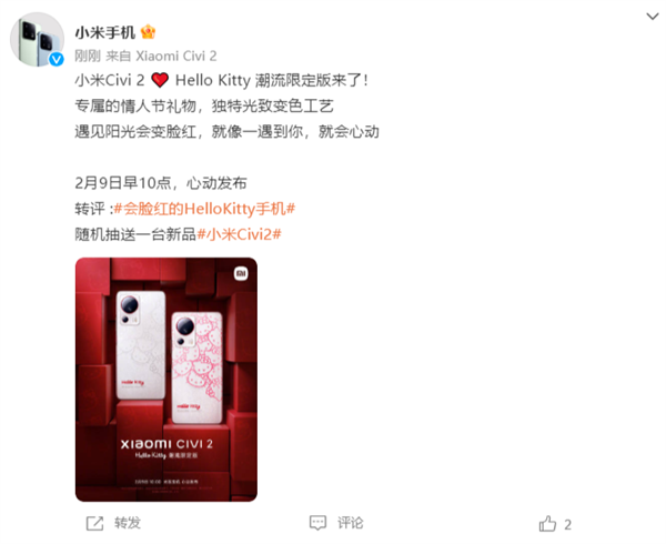 在这个情人节里,它不仅仅是一款拍照神器,更是一份爱的表达。小米Civi 2 Hello Kitty潮流限定版将于2月9日上午10点正式发布。