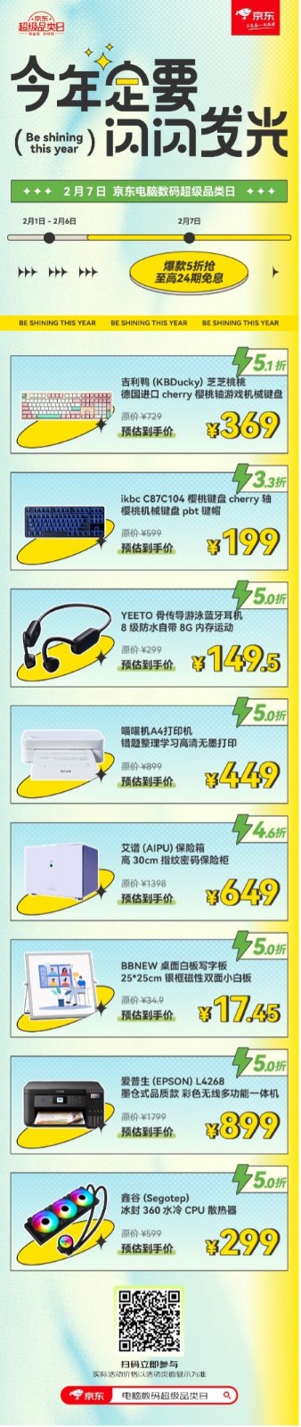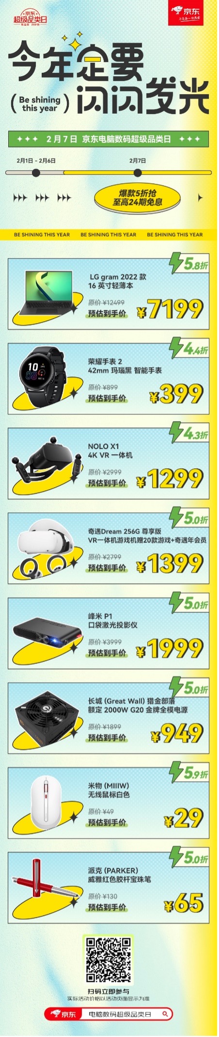 情人节即将到来,开工开学的号角声又刚刚吹响,让消费者购物热度不断升高。2月7日,为打造更省心更划算的购物过程,海量平价尖货倾巢出动,让京东电脑数码超级品类日的购物内容变得更加丰富,更为消费者带来了精选爆款清单,同时爆款5折抢、爆款直降千元,至高24期免息,以旧换新至高补贴1000元等实在福利也将齐上线。那么本次活动中都有哪些电脑数码产品荣登清单呢?让我们一探究竟!