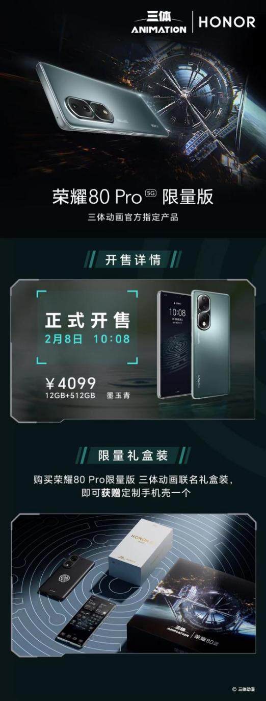 一直以来,荣耀数字系列都围绕年轻人的用户需求持续创新,致力于为年轻人带来更美好的生活体验。通过这次科技产品与科幻影视作品的梦幻联动,荣耀80 Pro也让科技与科幻爱好者对双方有了更大的想象空间。今日10点08分,荣耀80 Pro限量版三体动画联名礼盒正式开售,开启火爆抢购,感兴趣的朋友请不要错过入手良机!