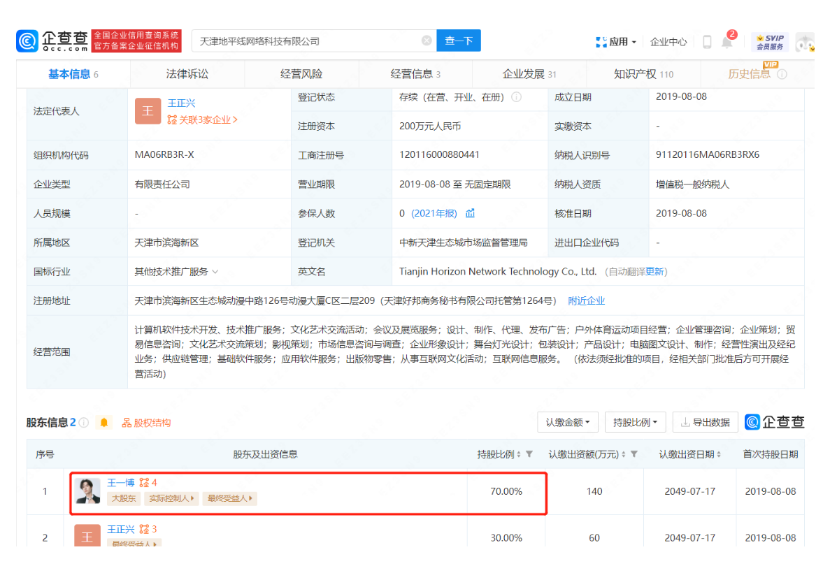 企查查信息显示,该公司成立于2019年8月,王一博持有70%股份,为疑似实际控制人,同时任监事一职。