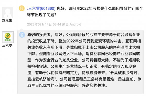 然而,360公司表示,随着互联网进入下半场,消费互联网已经向产业互联网转型,作为安全行业的龙头企业,公司将着眼大势,不能为了短期收益抱残守缺。公司生产经营情况一切正常,有稳定的收入和现金流,有助于公司保持战略定力,持续投资未来。