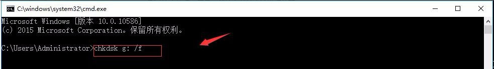 4、输入chkdsk g: /f,需要说明的是,g这个是指的你的U盘的盘符,你的U盘的盘符是哪一个,你就修改成哪一个字母就行了;