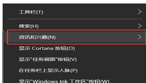 1、直接点击任务栏的空白位置,在出现的菜单中找到资讯和兴趣功能进行点击。