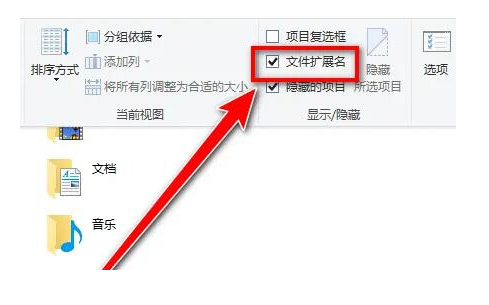 3、在打开的选项窗口中,找到文件扩展名功能,将其进行勾选,然后就可以看到显示系统文件后缀名了。