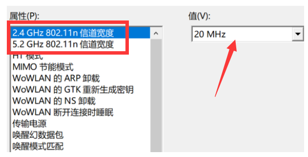 4、点击打开后,将属性中的【2.4GHz和5.2GHz】的值改为【20MHz】,然后保存设置。