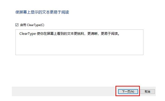 4、在打开的页面中点击勾选启用cleartype功能,并且点击右下角的下一页功能,根据提示来进行调试。