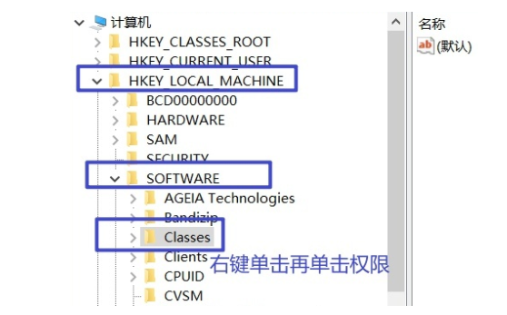 3、在注册表页面中,在左侧依次点击进入【HKEY_LOCAL_MACHINE-SOFTWARE-Classes】,在Classes文件中右键选择权限打开。