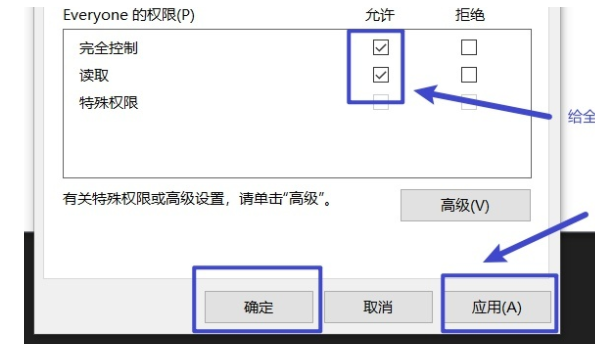 6、添加完成后,将everyone的权限打开,将完全控制和读取选择允许,在点击确定、应用即可。