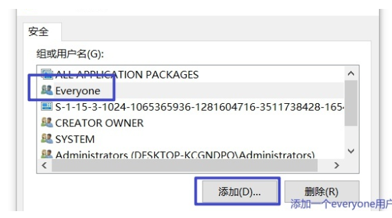 4、在打开的页面中找到【everyone】进行选中,如果没找到everyone可以点击添加功能。