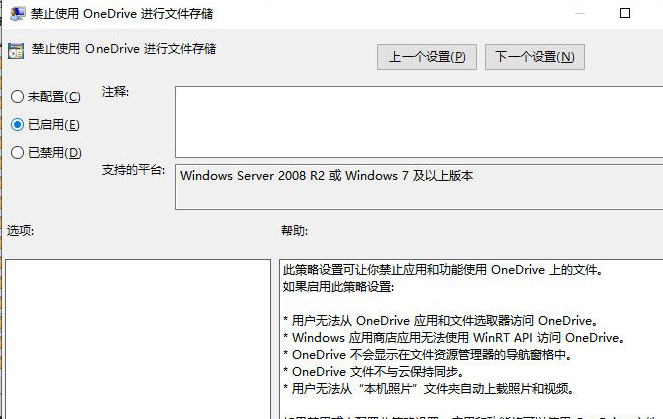 3、在打开的禁止使用OneDrive进行文件存储页面中,将已启用功能更改为已禁用功能,在点击确定进行保存设置即可。