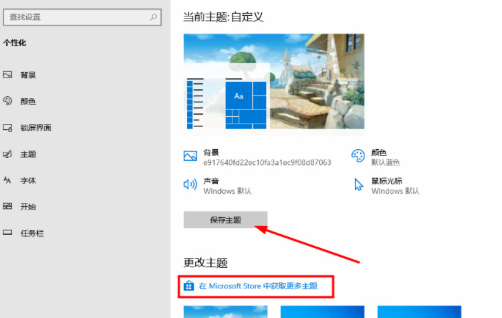 3、之后通过设置切换自己喜欢的风格主题,点击“保存主题”即可。(还可以点击“在Microsoft store中获取更多主题”进入主题商城下载免费主题)