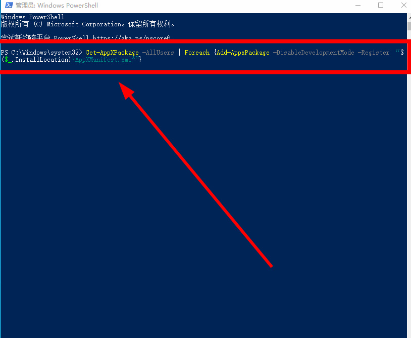 2.第二步,接着我们来到一个新页面,在页面末尾输入【Get-AppXPackage -AllUsers | Foreach {Add-AppxPackage -DisableDevelopmentMode -Register “$($_.InstallLocation)AppXManifest.xml”}】这样的一串代码,然后点击回车,这样任务栏也能使用了。