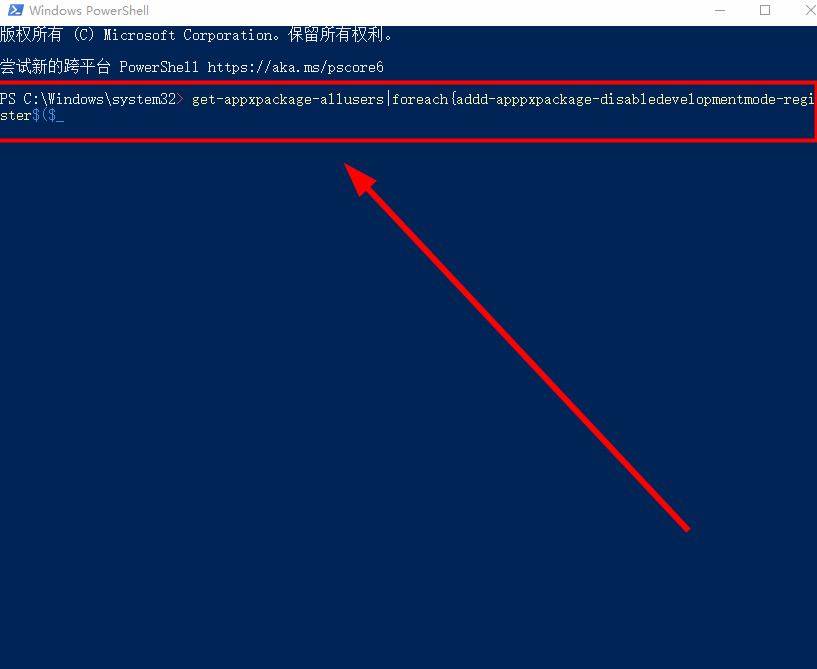 3.第三步,在新页面里输入【get-appxpackage-allusers|foreach{addd-apppxpackage-disabledevelopmentmode-register$($_】这样的一串代码,点击回车,最后关闭即可。