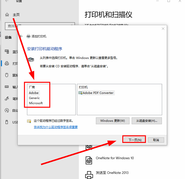 6.第六步,然后根据用户自己选择打印机的【厂商】和【型号】,在点击【下一页】。