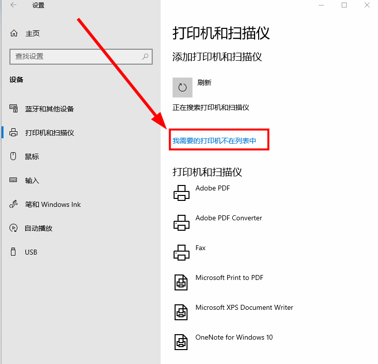 3.第三步,这时候它会自动搜索,如果没搜索到我们就需要点击下面的【我需要的打印机不在列表中】。