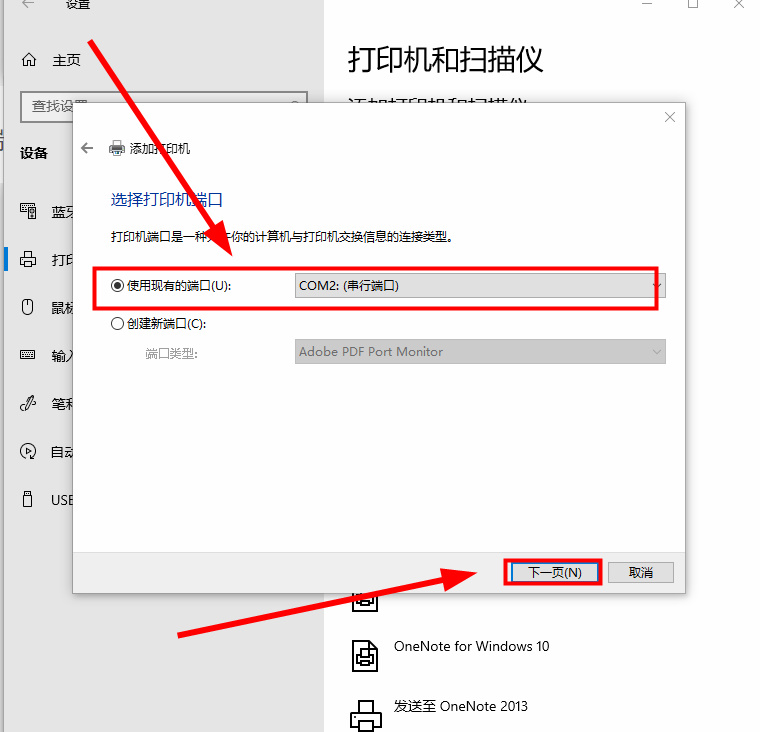 5.第五步,接着我们根据自己的需求在【使用现有的端口】旁边选择,选择好了点击【下一页】。(温馨提示:如果你使用的是USB接口的打印机,在弄之前需要连接电缆)