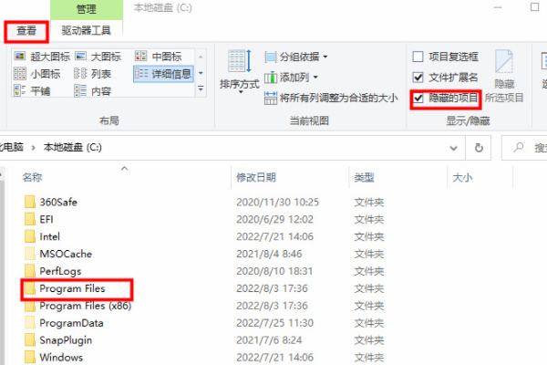 2、然后我们切换到“查看”再将“隐藏的项目”勾选上,然后点击进入“Program Files”文件夹;