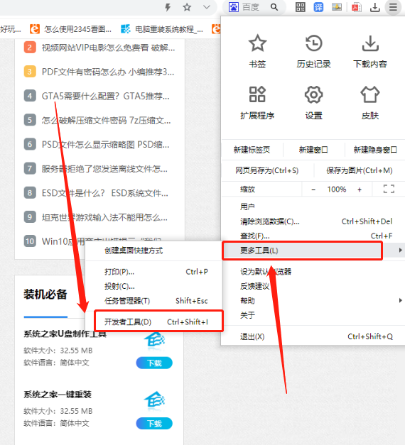 2.第二步,然后把鼠标放在下拉列表里的【更多工具】上面,点击右边的【开发者工具】。