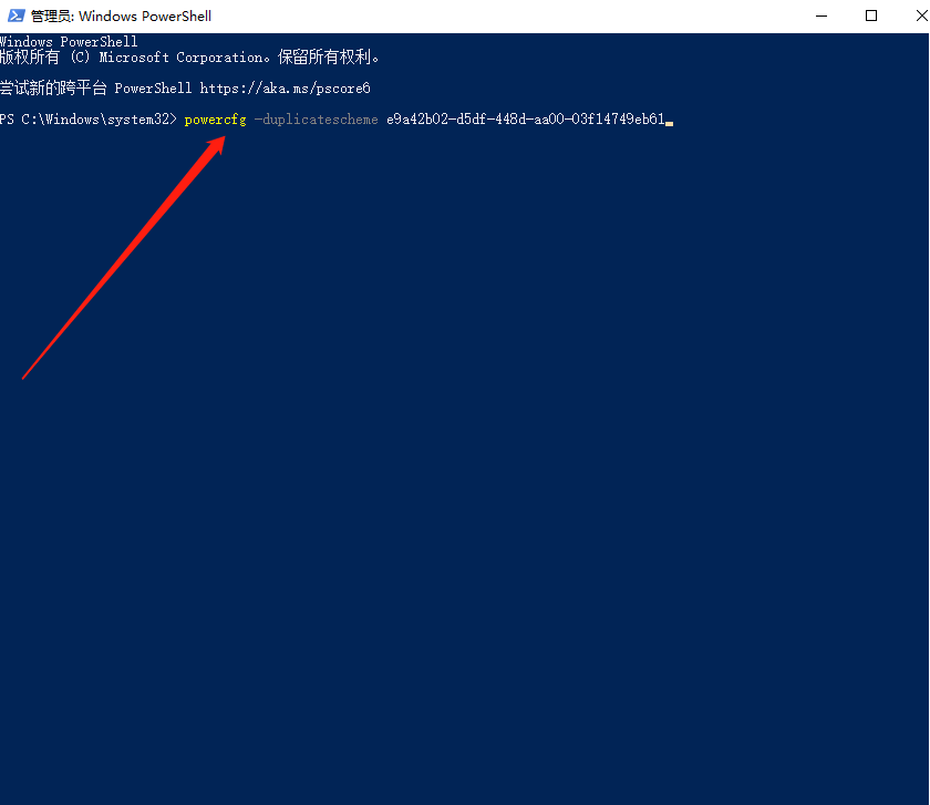 3.第三步,在下面代码的最后输入【powercfg -duplicatescheme e9a42b02-d5df-448d-aa00-03f14749eb61】这样一串代码,然后点击回车。