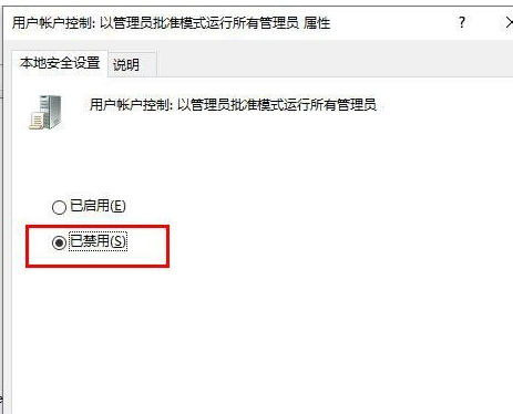 4、点击进入,在属性窗口中,将安全设置更改为已禁用,然后重启电脑即可解决问题。
