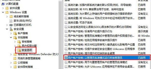 3、在打开的本地组策略编辑器中,在左侧栏目中依次打开计算机配置 -> Windows设置 -> 安全设置 -> 本地策略 -> 安全选项,然后在右侧栏目找到【用户帐户控制: 以管理员批准模式运行所有管理员】这个选项。