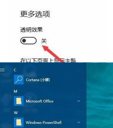 5、然后在右侧你可以看到一个透明效果的功能,将其打开,然后你就可以看到开始菜单变成透明的了。