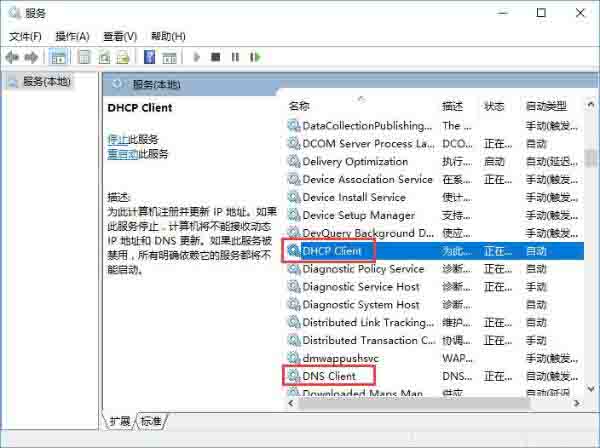 2、然后在服务功能中找到DNS Client和DHCP Client服务是否正常。