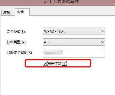 4、然后我们将选项卡调至【安全】界面,点击显示字符,这样我们就能够看到我们的wifi密码了。